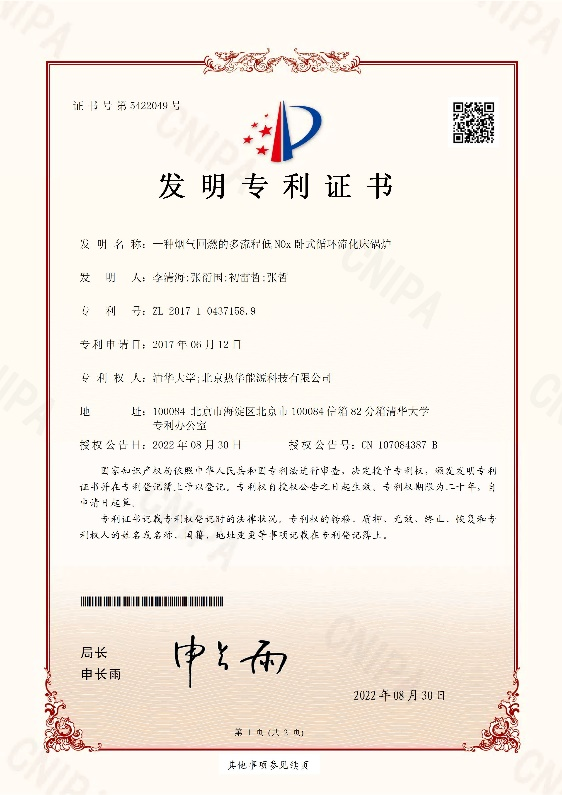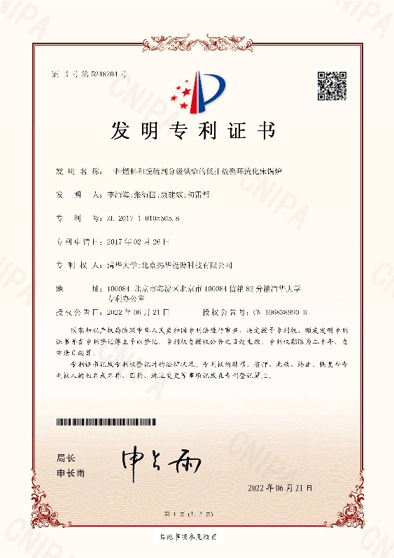 热华能源与清华大学共同研发的第9项发明专利“一种燃料和脱硫剂分级供给的低排放循环流化床锅炉”及第10项发明专利“一种烟气回燃的多流程低NOx卧式循环流化床锅炉”已于日前获得发明专利证书。