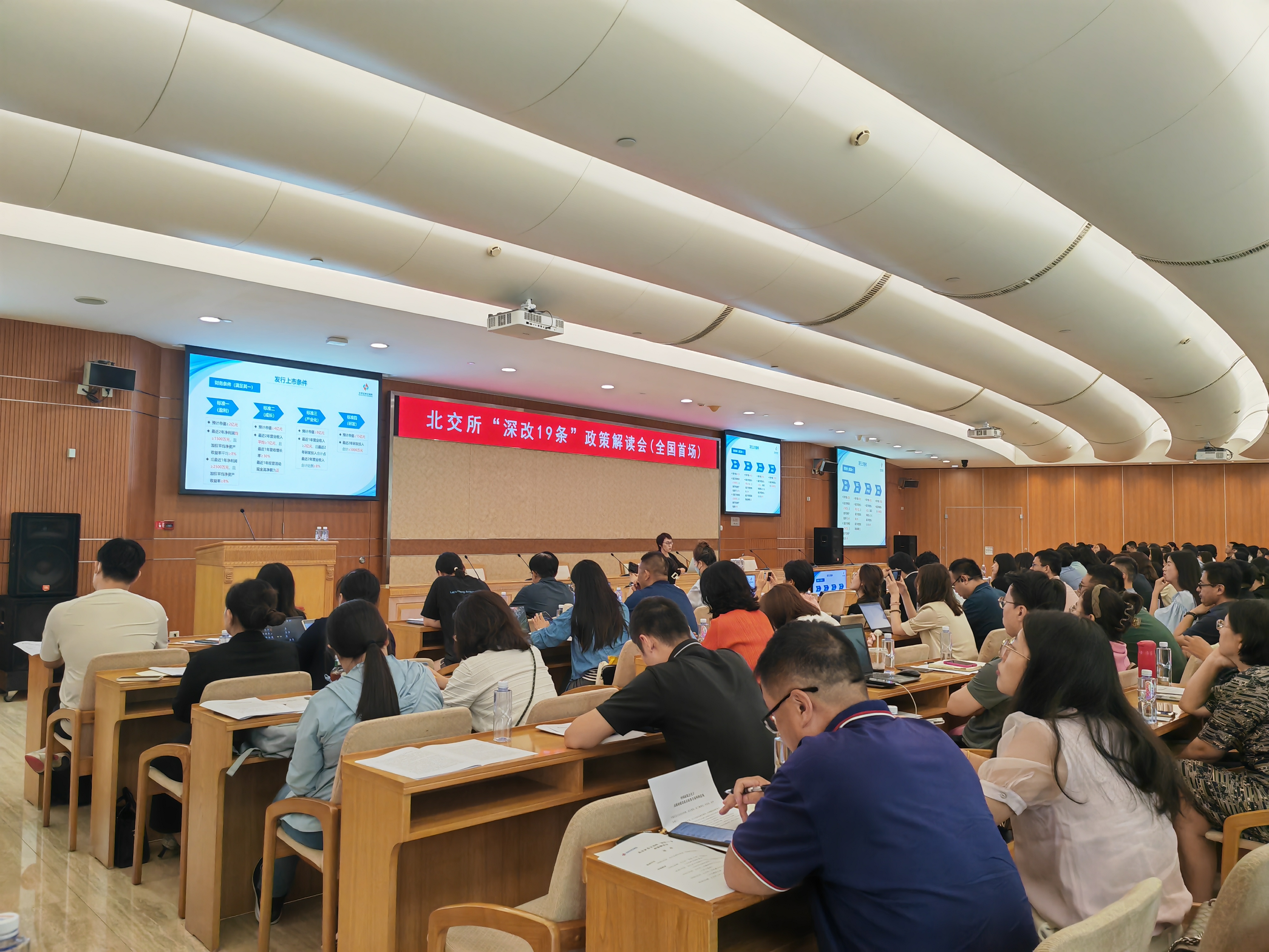 当日,北京市有关部门单位、各区相关负责同志,政府引导基金、拟上市企业代表等300余人现场参会。会上,北交所解读了本次改革的背景、意义、主要举措以及北交所市场情况和上市审核要点,市金融监管局介绍了北交所上市支持政策,北京证监局介绍了北交所申报企业辅导监管规定,证券公司代表、北交所上市公司代表分享了北交所上市经验和注意事项,现场气氛热烈。
