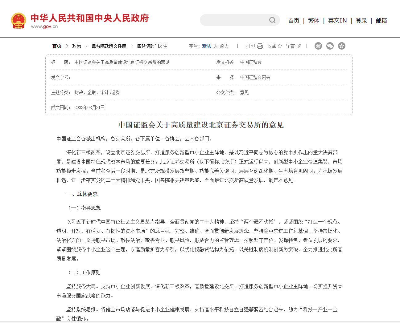 9月1日,中国证监会发布《关于高质量建设北京证券交易所的意见》,进一步推进北京证券交易所稳定发展和改革创新,加快打造服务创新型中小企业“主阵地”系统合力。《意见》共有19条内容,被称之为“北交所深改19条”。