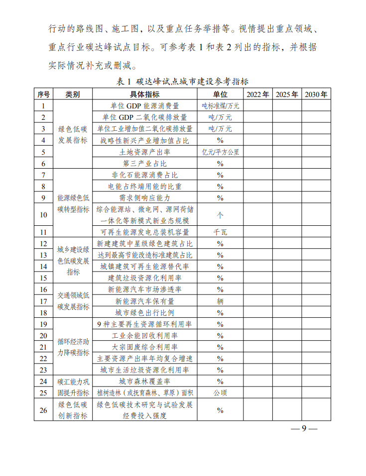2023年10月20日,国家发改委印发《国家碳达峰试点建设方案》。《方案》提出,在全国范围内选择 100 个具有典型代表性的城市和园区开展碳达峰试点建设,聚焦破解绿色低碳发展面临的瓶颈制约,激发地方主动性和创造性。首批国家碳达峰试点名额已安排35个,涉及省份包括河北、山西、内蒙古、辽宁、黑龙江、江苏、浙江、安徽、山东、河南、湖北、湖南、广东、陕西、新疆。