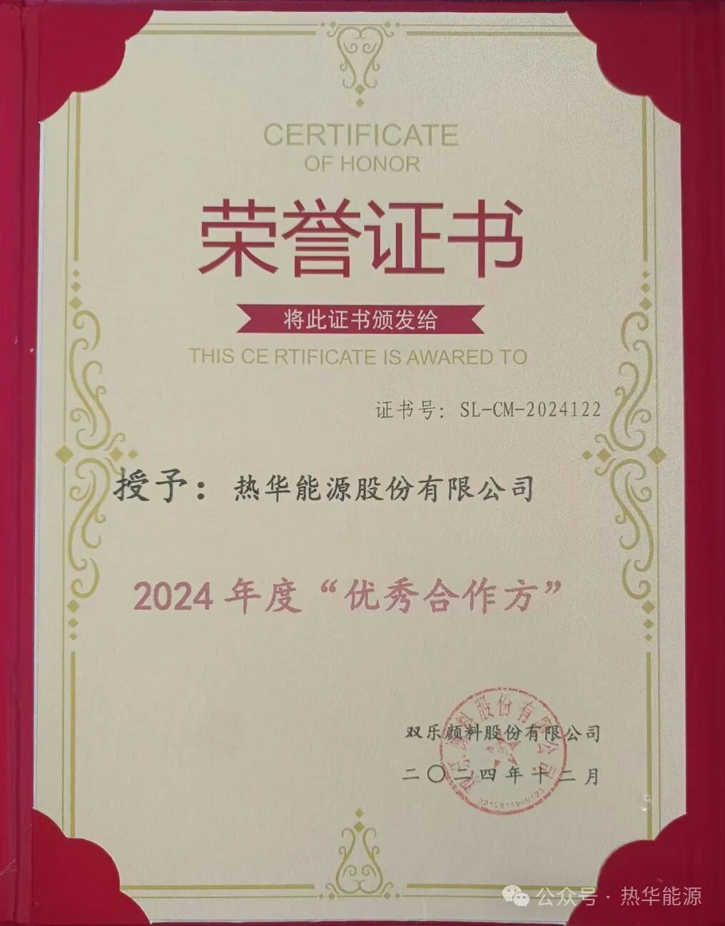 2024年岁末(12月31日),双乐颜料股份有限公司2024年度合作伙伴大会在江苏兴化市双乐颜料股份有限公司隆重召开。热华能源股份有限公司荣膺双乐股份(301036)“2024年度优秀合作方”称号。